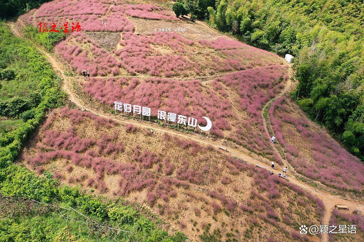 月宫山粉黛花海,位于东山村和金山村之间的山坡上,从两个方向都可以到达粉黛花海,赏花期间东山村方向容易交通拥堵,金山村方向则不堵不挤。