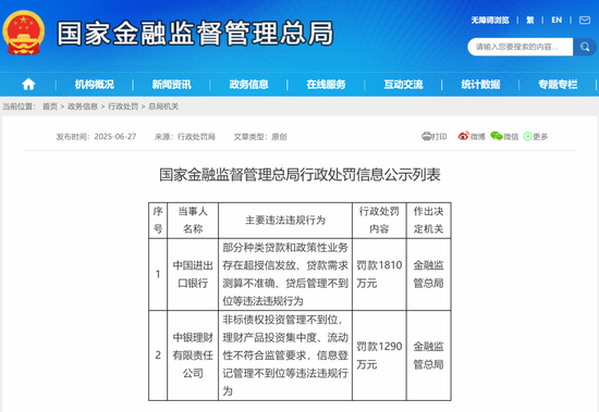 6月27日,金融监管总局官网披露行政处罚信息,进出口银行被罚款1810万元,中银理财有限责任公司被罚款1290万元。