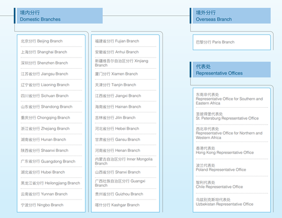 年报显示,截至2024年末,进出口银行在国内设有32家营业性分支机构和香港代表处,在海外设有巴黎分行和7个代表处。其中,境内分行设立在28个省级行政区(宁夏、西藏、青海除外,还单独在厦门、宁波、深圳、喀什4座城市设有分行)。