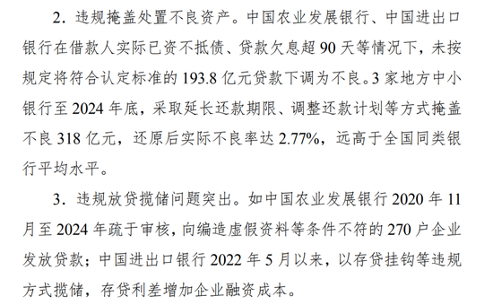 此外,审计署6月发布了《国务院关于2024年度中央预算执行和其他财政收支的审计工作报告》。其中提到,农业发展银行和进出口银行存在违规掩盖处置不良资产、违规放贷揽储等问题。